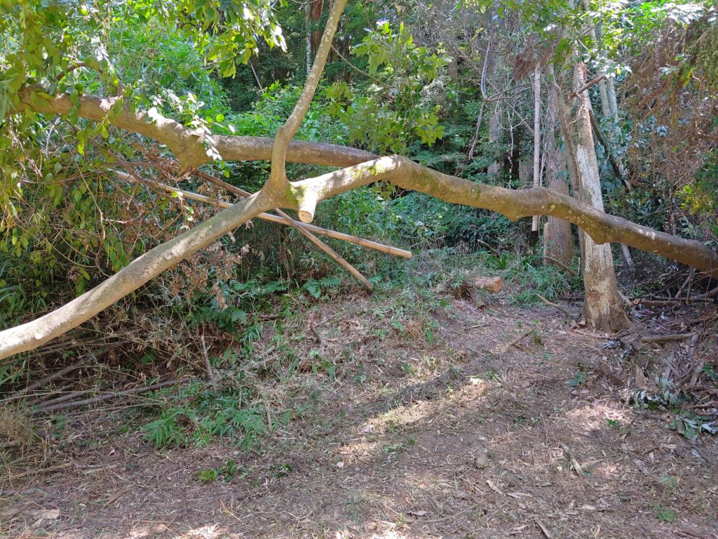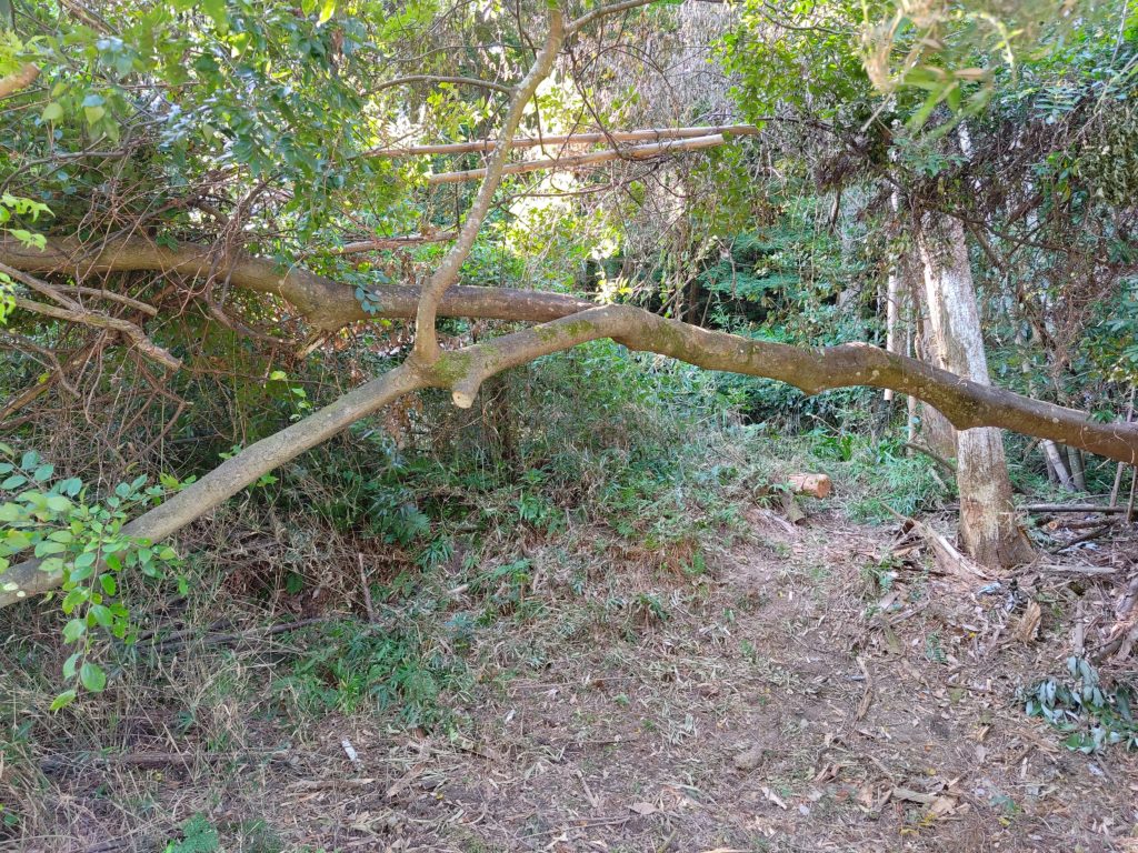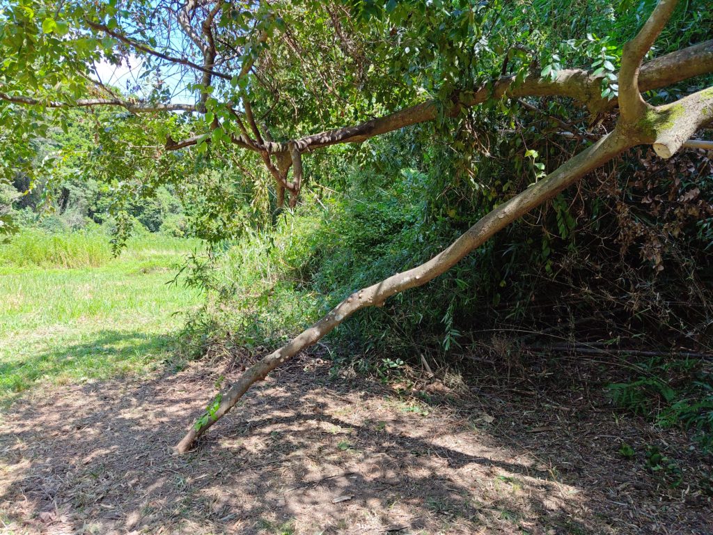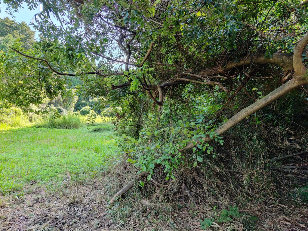 この横たわっている木、生きているんですよね。倒れて半分ほど根も切れたが残った根で生きながらえています。ですが、最後の写真を見ての通り先端が地面に刺さってます。これで支えているとなると生かしつつ途中で切るのは難しいので暫く放置です。ただし、正面にかなりのスペースがあるのですが、この木を現状のままバイク等でくぐるのは難しいので何れ斜面を加工するか別のルートを作る予定です。これまた写真が無いですが、こうやって切った木や枝をこの手前の右側、となりの田んぼとの境に積み上げているのですが、ついに高さが人の高さを超えました。もうすこし涼しくなったら焚き火しようと思います。